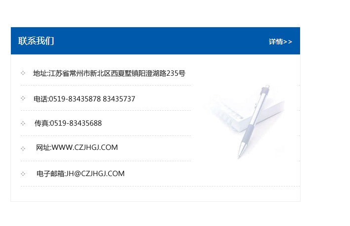 地址:常州市新北區(qū)友邦商務大廈1幢16、17層  電話:0519-85101652  傳真:0519-85112595  郵編:213022  網址:www.cz-jiayue_cn.haozhangsheng.com  郵箱:xiajifengaa@163.com
